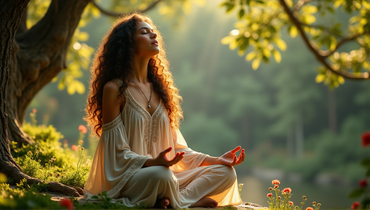 "A serene woman sits on a natural stone bench in a lush forest, surrounded by towering trees and vibrant foliage, exuding inner peace amidst nature's tranquility."