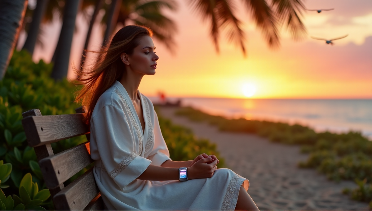 "A serene woman sits on a beach bench at sunset, surrounded by lush greenery and palm trees, cradling a sleek silver smartwatch amidst natural beauty."