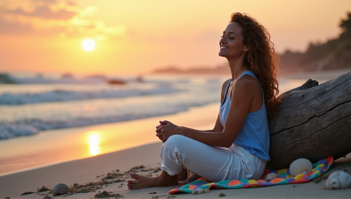 "A serene woman sits on a tranquil beach at sunset, surrounded by gentle waves and soft sand, embodying inner calm with digital wellness tools."